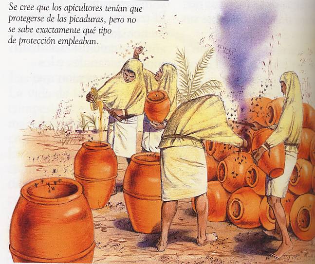 Buscandote imagenes de la apicultura egipcia, lo máximo que te he conseguido es que en las paredes de la tumba de Rekh-Mi-Re (tumbas de Luxor) hay una pintura en la que se representan todas las fases de la industria de la miel; cómo los peines fueron quitados de las colmenas con la ayuda del humo, como la hornada de la miel se apelmaza, el relleno y el lacre de tarros... Too existe otra en el Templo del Sol de Neuserre (Egipto, 2,400 A.C.) representando a un apicultor en sus tareas con panales en las colmenas y el llenado de ánforas.