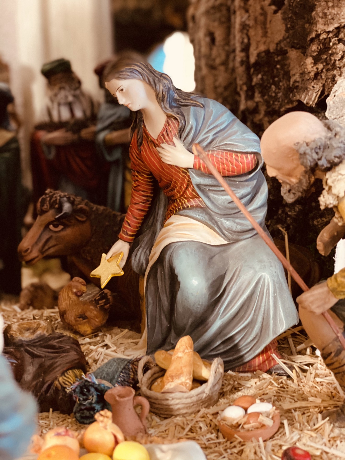 Ahora los personajes de escena están como asomados al pretil del escenario, mirando al público en un pasillo de despedida.. los que estaban junto al pozo, los que conversaban por el camino, los que contemplaban el misterio, el niño, el joven, el viejo, la nueva de última hora… todos con sus ovejas, con gallos y gallinas… allí asomados al balcón de la gruta de Belén, contemplando contigo y conmigo la escena que se divisa al fondo…