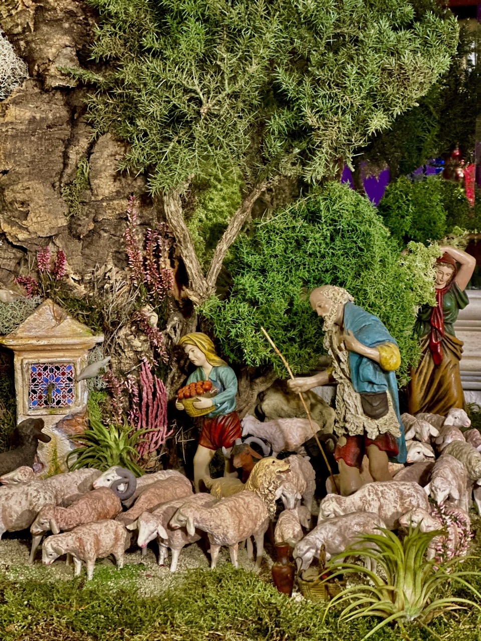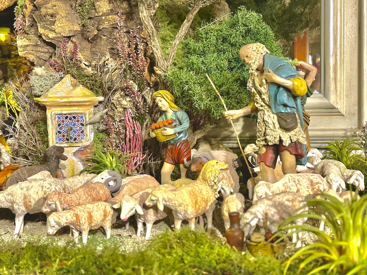 Escena de la anunciación a los pastores con figuras de Ortigas y un niño de José Joaquín Pérez. Animales de los Hermanos Cerrada y Daniel. El atrezzo es de Casa Quevedo (Jerez), Alfares Sevilla, Cristina Domíguez (Jerez). La vegetación confiada siempre a Florever.