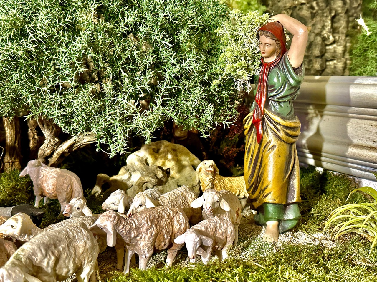 Escena de la anunciación a los pastores con figuras de Ortigas y un niño de José Joaquín Pérez. Animales de los Hermanos Cerrada y Daniel. El atrezzo es de Casa Quevedo (Jerez), Alfares Sevilla, Cristina Domíguez (Jerez). La vegetación confiada siempre a Florever.