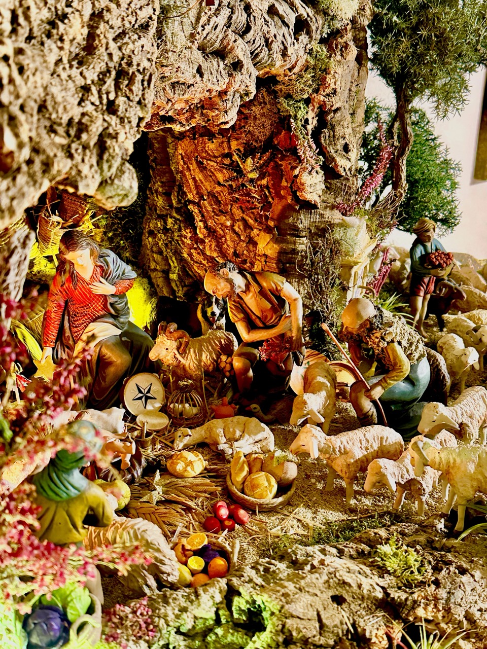 En una composición donde primarn las figuras de gran tamaño (Serie de 21cm) las que son de pequeño formato dan la posibilidad de generar perspectivas, lejanías, escenas paralelas a la escena principal... en este caso las dos mujeres están situadas bajo el arbol que ha crecido sobre la cueva donde se centra el Nacimiento... aún quedan esapcios por descubir del Belén Malkior 2023.