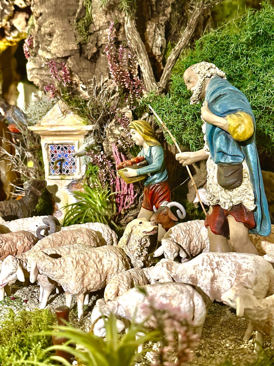 Escena de la anunciación a los pastores con figuras de Ortigas y un niño de José Joaquín Pérez. Animales de los Hermanos Cerrada y Daniel. El atrezzo es de Casa Quevedo (Jerez), Alfares Sevilla, Cristina Domíguez (Jerez). La vegetación confiada siempre a Florever.