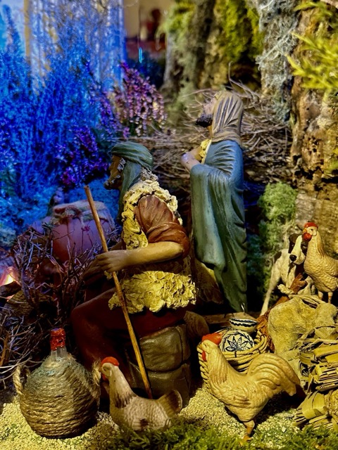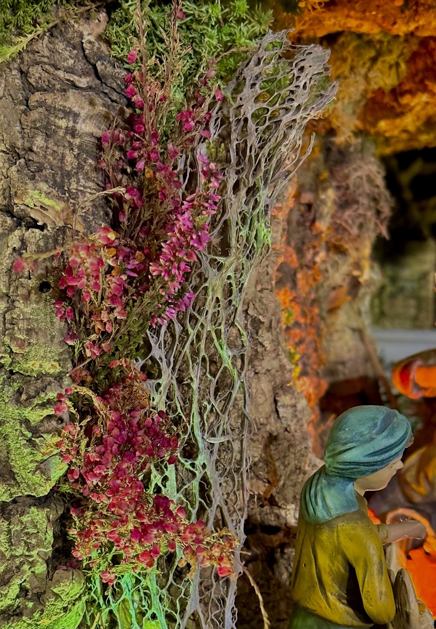 En una composición donde primarn las figuras de gran tamaño (Serie de 21cm) las que son de pequeño formato dan la posibilidad de generar perspectivas, lejanías, escenas paralelas a la escena principal... en este caso las dos mujeres están situadas bajo el arbol que ha crecido sobre la cueva donde se centra el Nacimiento... aún quedan esapcios por descubir del Belén Malkior 2023.