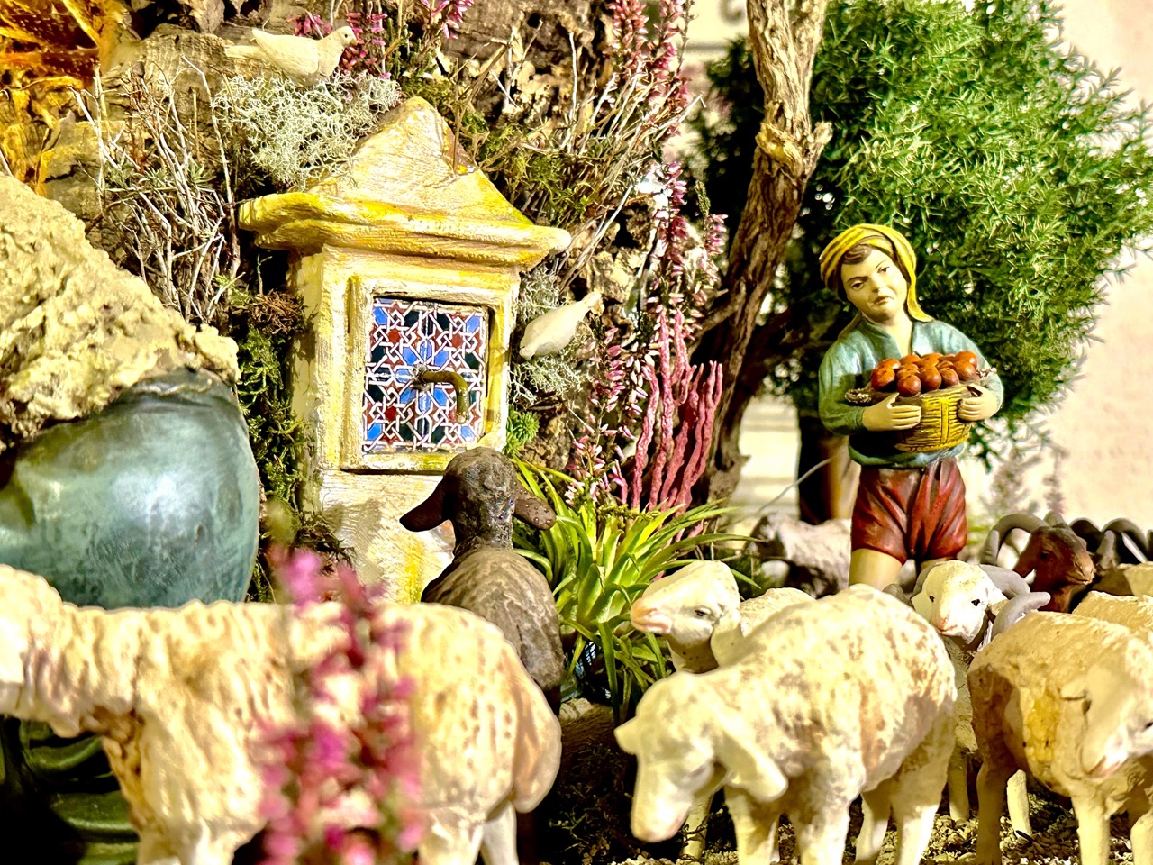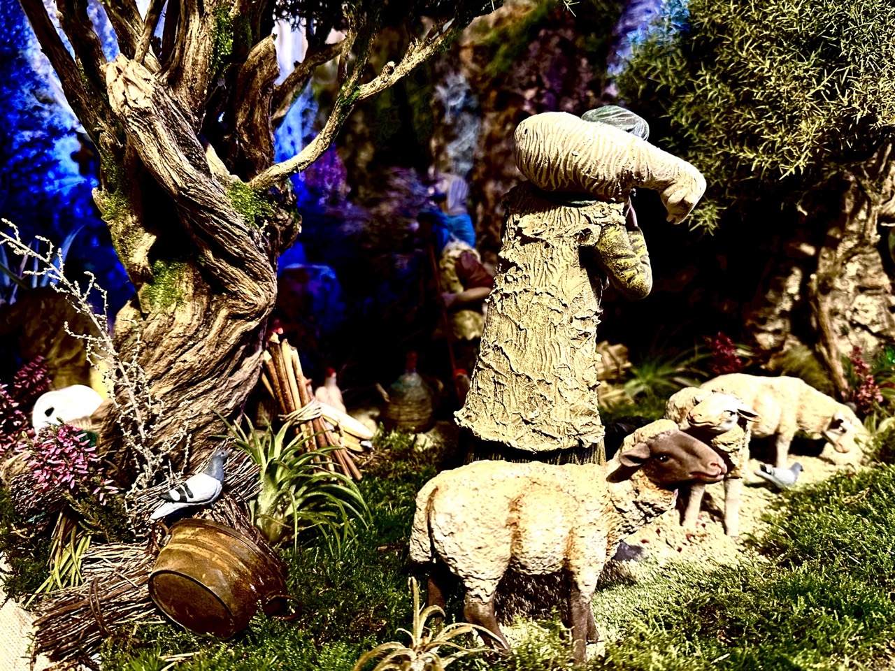 Escena de la anunciación a los pastores con figuras de Ortigas y un niño de José Joaquín Pérez. Animales de los Hermanos Cerrada y Daniel. El atrezzo es de Casa Quevedo (Jerez), Alfares Sevilla, Cristina Domíguez (Jerez). La vegetación confiada siempre a Florever.