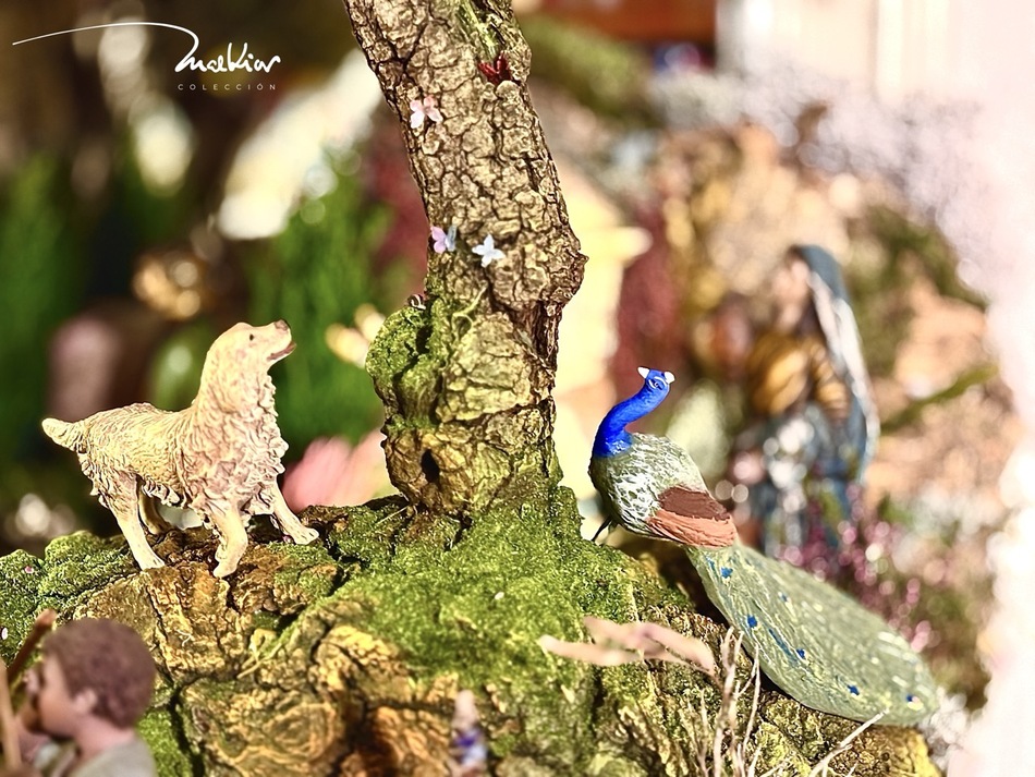 Pero destaca, con una nobleza casi fuera de lugar en este entorno rústico, la figura del pavo real…. acaba de llegar a la Colección, desde talleres de barros granadinos, para quedarse. En la iconografía cristiana antigua, esta ave no era un mero adorno exótico; simbolizaba la inmortalidad y la resurrección, pues se creía que su carne no se corrompía tras la muerte. Su presencia aquí, erguida y solemne justo después de la escena de la "rotura" del cántaro y la fragilidad de Benjamín, es un guiño teológico sutil pero poderoso: lo que se rompe puede ser restaurado. Sus plumas, tachonadas de "ojos", parecen vigilar el Misterio. La belleza permanece impasible, vigilante, recordándonos que el Jardín del Edén no está tan lejos si sabemos mirar entre la maleza y los escombros de nuestros fracasos.