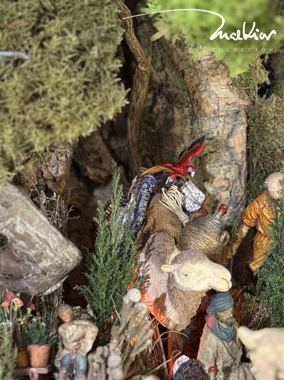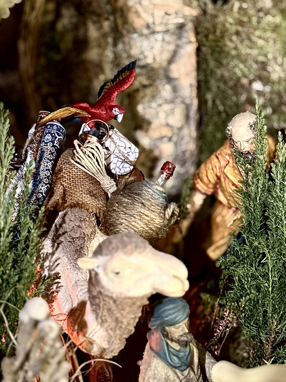 Belen_Malkior_2025_113.jpeg (192KB - 6 descargas)La exégesis del color. El loro y la carga . [Danza Morisca - Jordi Savall] - Cuando la mirada se acostumbra a la sobriedad del musgo y a la liturgia monocroma de la piedra, el Belén reclama su derecho a la sorpresa. En este recodo del camino, donde la razón descansa y la fe camina, ha estallado el rojo. No es una anécdota zoológica; no es ni mucho menos una connotación política, es una categoría teológica.