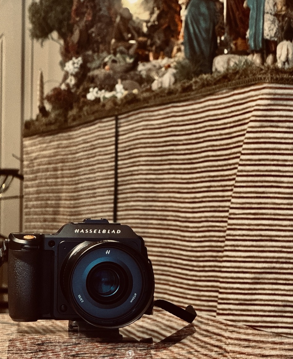 Sobre la mesa, descansando con la gravedad de un objeto sagrado, está la cámara. Al fondo, desenfocado pero vibrante, el Belén. Aquí se establece el primer diálogo entre lo efímero y lo eterno. El barro y el musgo están condenados a desaparecer, a secarse, a volver al polvo del que nacieron. Pero la cámara es la promesa de la resurrección visual. Esa lente oscura y profunda es el ojo de Simeón que se prepara para capturar la Luz y no dejarla escapar. Es la máquina del tiempo que Miguel de Unamuno hubiera envidiado, esa herramienta capaz de vencer a la muerte del instante, congelando el "ahora" para transformarlo en un "siempre". El objetivo está abierto, esperando tragar luz. No es tecnología fría; es un cáliz moderno preparado para recoger la esencia de dos meses de trabajo y fe.
