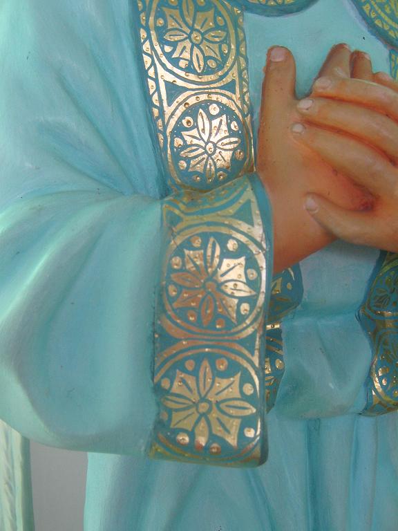 y para terminar veladuras de óleo mezclando con Médium (Lefranc) con pinceladas muy extendias para que transparente el oro o plata, esto es a grandes rasgos el proceso, aunque en éste tambien hay BOL(vestido de la Virgen) para rallarlo despues, pero es muy engorroso y no lo volví a poner, pero creo que así se imita la imagineria del s/XVII. En figuras es más dificil poner el pan de oro por los recovecos, pero en un marco es mucho más sencillo, el marco de las tres últimas fotos de la muñeca de otras "otras artes"(estan un mensaje más abajo que las que vistes) está hecho en pan de oro y se tarda muy poquito en hacerlo. Tengo una amiga pintora y la cobraban un dineral por forrarle marcos lisos en plata, yo se los hice y sólo se gastó en los librillos de pan de plata, el trabajo se lo hice gratis,ja,ja, para eso están los amigos¿no? Y tienes. razón, sobre todo si haces dibujitos en los mantos puede quedar como adamascado. Me he extendido mucho, pero es dificil explicar de esta manera el proceso, lo mejor es que te compres un librito de oro o plata y practiques con un marquito, te va a quedar muy chuli, ya verás.Gracias por lo de los ojos, pero eso era antes, ahora son mis ojos los que no pueden pintar esas miniaturas sino tengo una lupa,ja,ja. Si quieres más información, ya sabes dónde encontrarme. Gracias y un saludo afectuoso.