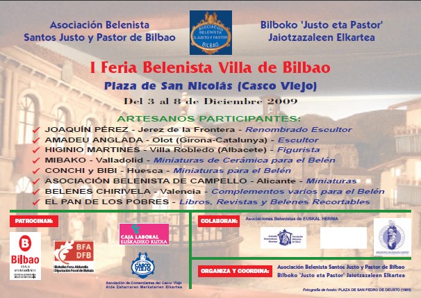 , junto al Arenal bilbaíno, donde participaremos junto con el resto de artesanos expositores, Joaquín Pérez (escultor), Amadeu Anglada (escultor), Higinio Martínez (figurista), Mibako (ceramista), Conchi y Bibi (miniaturas), Asociación Belenista de Campello - Alicante (miniaturas), Belenes Chirivella (complementos) y El Pan de los Pobres (varios) en dicha Feria, que esperamos sea un éxito.