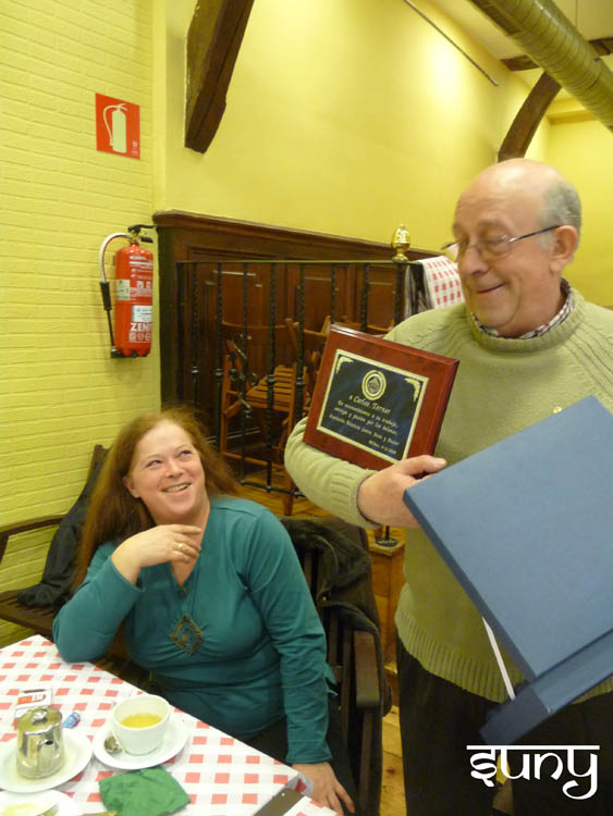 Aprovechando que estábamos entre amigos, le hicimos entrega a nuestro Presidente Carlos, una placa de reconocimiento a su labor, ya que el día que teníamos previsto entregársela, tuvimos la desgracia de que nos dejara nuestro compañero y amigo José Ramón Oza, por lo que suspendimos todo. El en todo momento ha estado y sigue estando presente, en todos nuestros acontecimientos y es una pena que no haya podido disfrutar de la 1ª Feria Belenista que se celebra en nuestra villa.