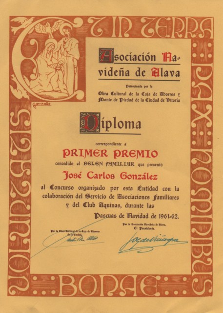 La cita del Don Camilo, aun arriesgada en los años sesenta, refleja el espíritu de aquel certamen. Ariznavarra, Adurza o Zaramaga, son barrios obreros que entonces se estaban construyendo y poblando en Vitoria, dando cabida a los nuevos trabajadores de la pujante industria. Respecto a los premios, a mediados de los años 60 se entregaban hasta un total de cuarenta, ¡sólo en la categoría de belenes familiares! Tal cantidad de premiados hacía que el importe económico fuese más reducido que en la categoría de belenes colectivos –instituciones civiles, militares y religiosas esencialmente-. Siguiendo todavía el artículo de Fin de año encontramos nombres que ya nos son familiares; destacaban entonces las participaciones de don Félix Ortiz de Mendíbil, el presbítero encargado del montaje del belén de la Catedral Vieja, Luis María Sánchez Iñigo, uno de los impulsores del Belén Monumental de la Florida, o las familias Bastida-González de Viñaspre y González-Mecolay. Ya en este mismo artículo se habla de la “Asociación Navideña de Álava”, un grupo difícil de calificar y de historia tremendamente difusa. Debido a los problemas que planteaba la Ley de Asociación durante los años del franquismo, debió resultar más sencillo para aquellos belenistas agruparse bajo el paraguas de otros colectivos ya legalizados, como la Acción Católica, los Centros sociales, etcétera; esto explicaría la falta de rastro escrito acerca de tal “Asociación Navideña” como entidad independiente, así como los diferentes organizadores del Concurso de belenes a lo largo de su historia, tal y como muestran los diplomas conservados. En este sentido, la revista Jayez , una publicación del sector inmobiliario vitoriano, señala en un artículo de 1980 cómo «el concurso de belenes que la Caja de Ahorros Municipal viene organizando desde hace treinta años, ha actuado como cristalizador e impulsor de una costumbre tan popular como hacer el belén. Dentro de la Caja, llegó a funcionar una “Asociación Navideña de Álava, que no llegado a adquirir entidad legal hasta el momento». Y nunca lo haría. Habría que esperar a 1987, con la legalización de Asociación Belenista de Álava.