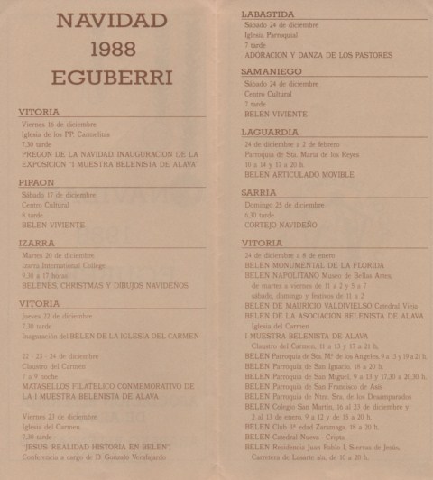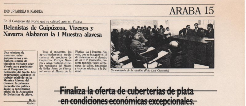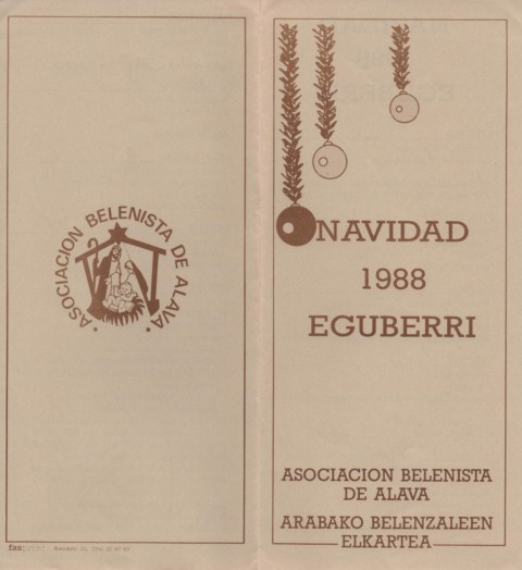 Sin embargo, a finales de los años ´80, la idea de legalizar por fin una Asociación Belenista fue impulsada por los responsables de los principales belenes que entonces se montaban. De algún modo, se consolidó el espíritu belenista que había inundado la ciudad desde principios de siglo, y que superó periodos de decadencia con las reformas del Concilio Vaticano II, la llegada de tradiciones procedentes de Europa del Norte y América o la consolidación de otras locales como el popular Olentzero . El 17 de octubre de 1987 tuvo lugar la asamblea fundacional y la aprobación de los primeros estatutos de la llamada «Asociación Belenista de Álava/Arabako Belentzaleen Elkartea», redactados por el padre Juan Cruz Apodaca (O.C.D). Un año después, en las navidades de 1988, fue inaugurada la «Iª Muestra Belenista de Álava» y Joaquín Jiménez anunciaba a la ciudad la llegada de la Navidad en el primer «Pregón de la Navidad» que organizaba nuestro colectivo. Pero de las actividades que desde entonces y durante estos 25 años hemos desarrollado, os hablaremos en el siguiente post.