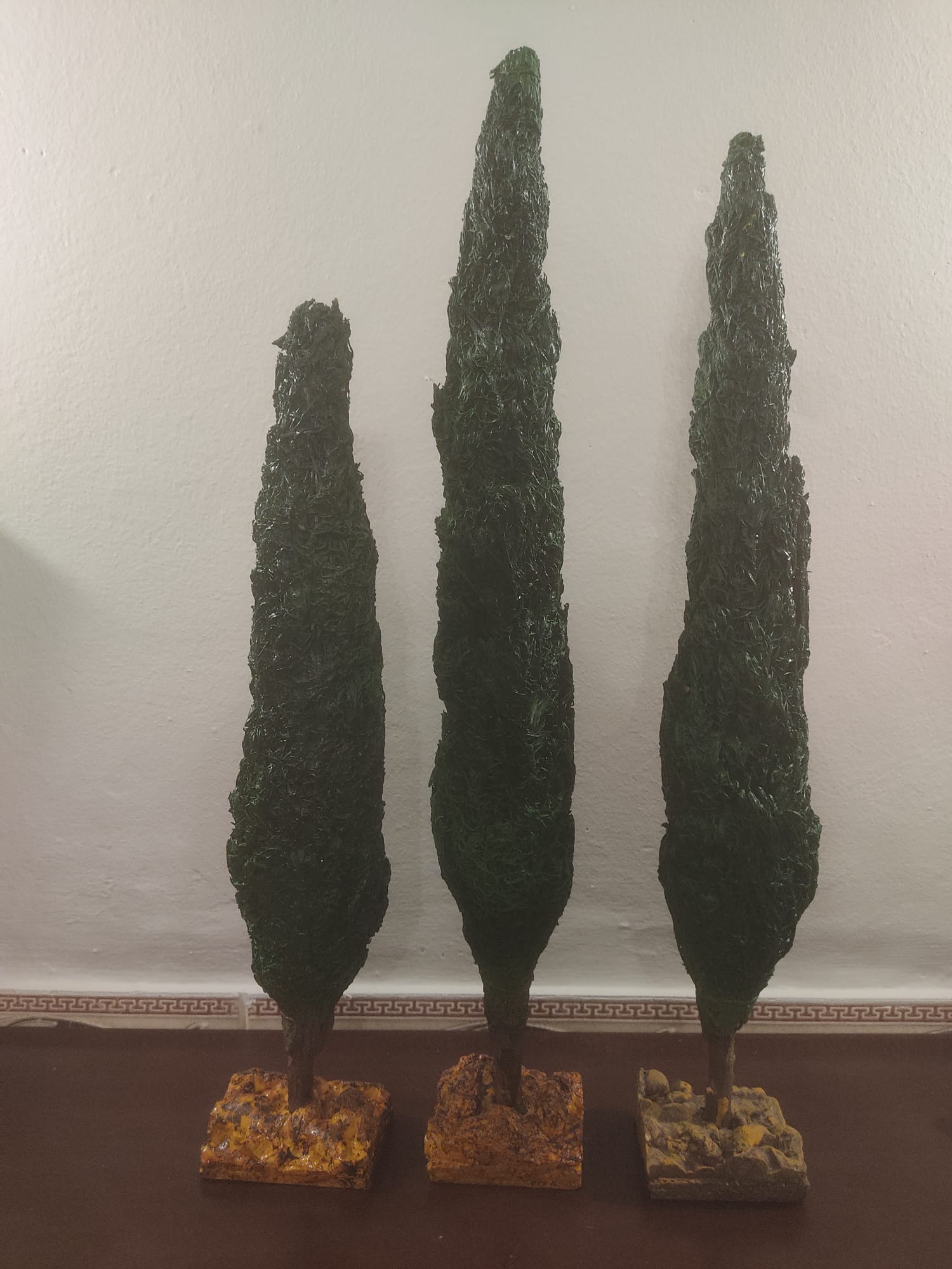 Vendo estos tres cipreses de 45 cm, 55 cm y 53 cm de altura, respectivamente.