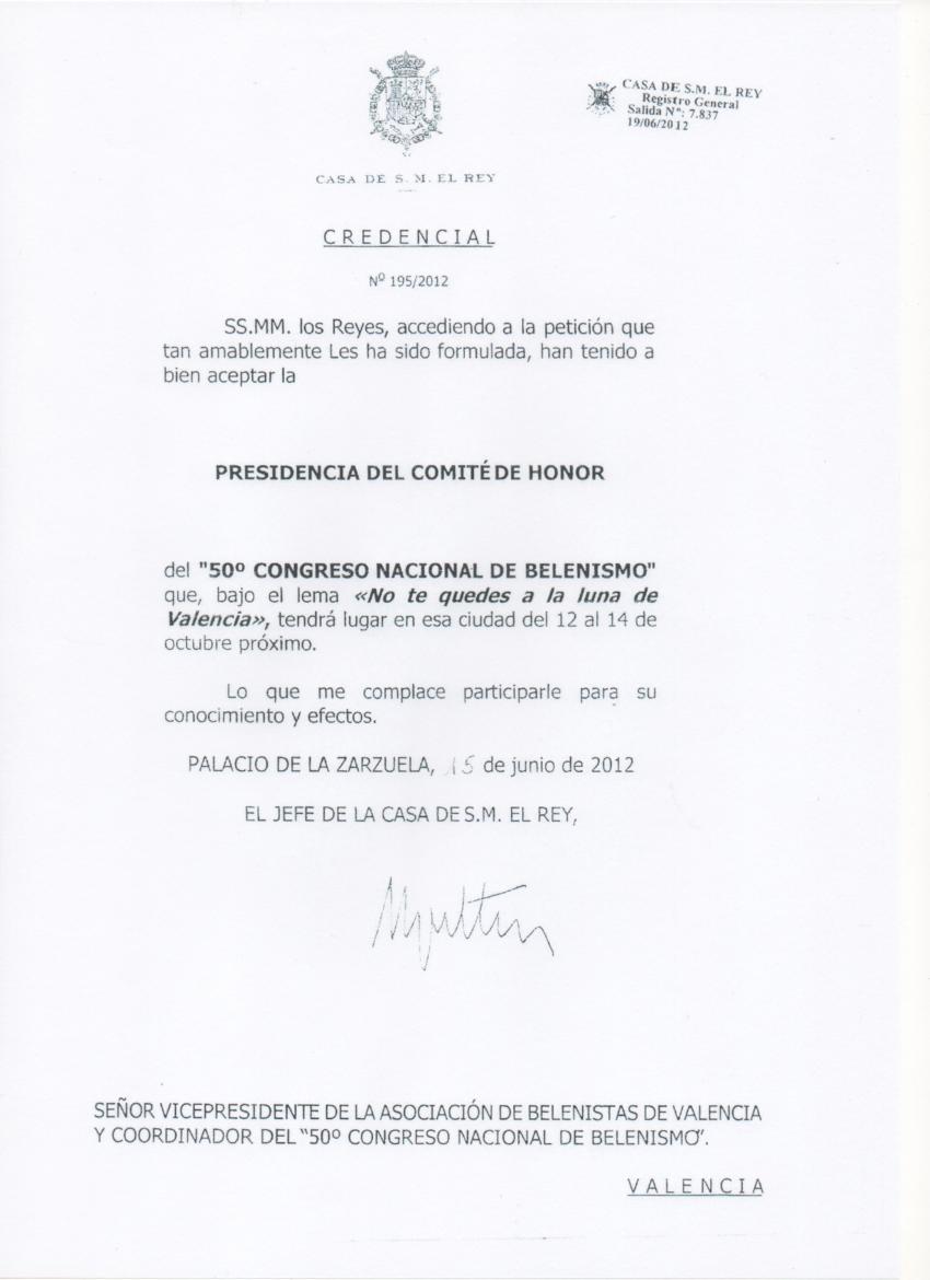 A.B.VALENCIA - 25/6/2012 19:55 Hola de nuevo compañeros, tenemos el placer de comunicaros que accediendo a la petición que en su día efectuó nuestro Coordinador del Congreso Pedro Ródenas, en nombre de la Asociación de Belenistas de Valencia, SS.MM. los Reyes han aceptado la Presidencia del Comité de Honor del 50 Congreso Nacional de Belenismo, lo que nos llena de satisfacción, por el incondicional apoyo de la Casa Real a toda la familia Belenista en una efemeride tan importante como son estos Cincuenta años de fomento del Belenismo por toda España.