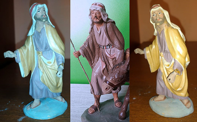 Hablando de copias, moldes de ida y vuelta, "apretadas", cuelgo las fotos de un San José en Huída de Castells, para que comparemos con el de Daniel que nos ha colgado Felorz. Aunque de mucha mejor calidad en la ejecución el Daniel, me parece que el de Castells es el original, en especial porque hemos de tener como axioma que las figuras del taller Castells son siempre originales suyas.