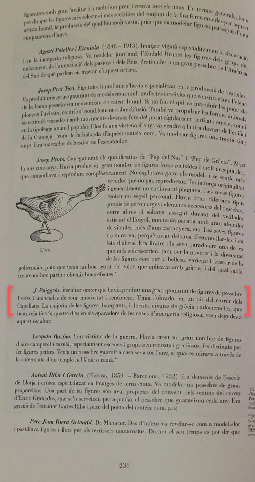 J. Puiggròs. Escultor de santos que había producido una cantidad de figuras de pesebre frías y carentes de toda emotividad y sentimiento. Tenía el taller en un piso de la calle dels Capellans. La mayoría de las figuras, llamativas, y relucientes, sin gracia y adocenadas, que se veía hasta hace cuatro días en los escaparates de las casas de imaginería religiosa, eran debidas a este escultor.