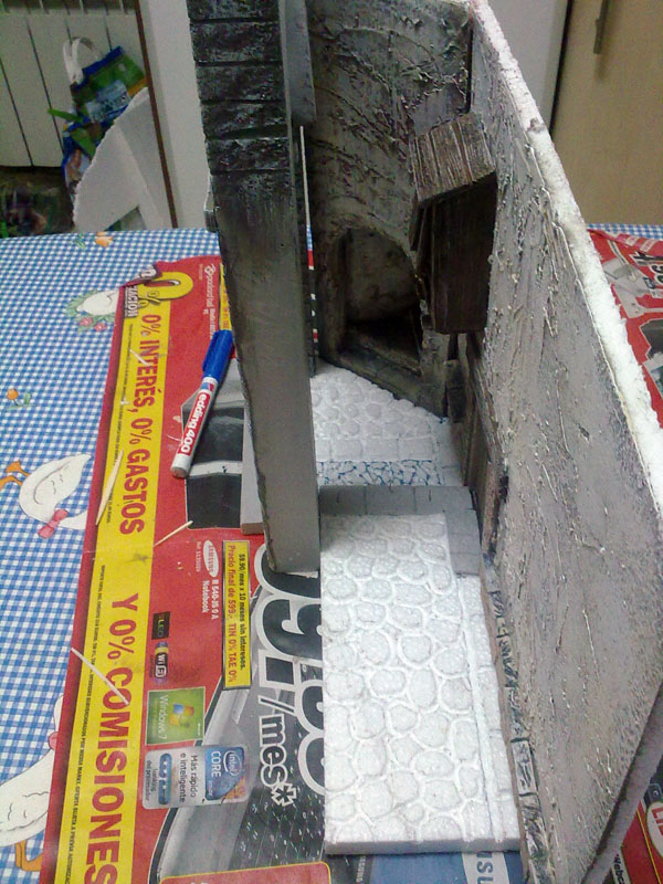 Santiago me gusta mucho lo que estás haciendo y para ser el primero está bastante bien, ahora bien a mi me gusta que critiquen positivamente mis trabajos, pues es la única manera de mejorar y avanzar en esto del belenismo (fijate en mis post la cantidad de críticas que recibo y que asumo y corrijo), por lo tanto yo te voy a dar mi humilde opinión. Creo que tienes tiempo suficiente de aqui hasta diciembre que es cuando se supone que montarás el belén, por lo que muchos de los trabajos que estás haciendo en porexpan del de bolitas y luego tallando (supongo que con soldador) lo podrías hacer pieza a pieza del porexpan duro (del de colores, el mismo que utilizas para hacer las losetas del suelo), te quedarían los arcos y las piedras talladas mucho mas realistas, pues veo que tienes habilidad con la pìntura; si quieres fíjate en mi albúm del año pasado que se llama "Belén dedicado a los maestros del foro", este belén también es el primero que he hecho con las técnicas aprendidas de los maestros del foro y una de las cosas mas importantes es que si quieres dar realismo, en ciertas partes, las piezas han de ser talladas una a una y colocadas y pegadas también una a una, con lo que se consigue un realismo fantástico, asi que mi consejo, si es que puedo dártelo como novato que también soy, es que las columnas, los arcos, los rebordes de las puertas, los ladrillos, etc. etc. etc., los hagas tallados en porexpan del duro pues además te evitas darle luego escayola pues la pintura agarra perfectamente siempre y cuando le lijes la primera capa satinada que tiene ese porexpan.