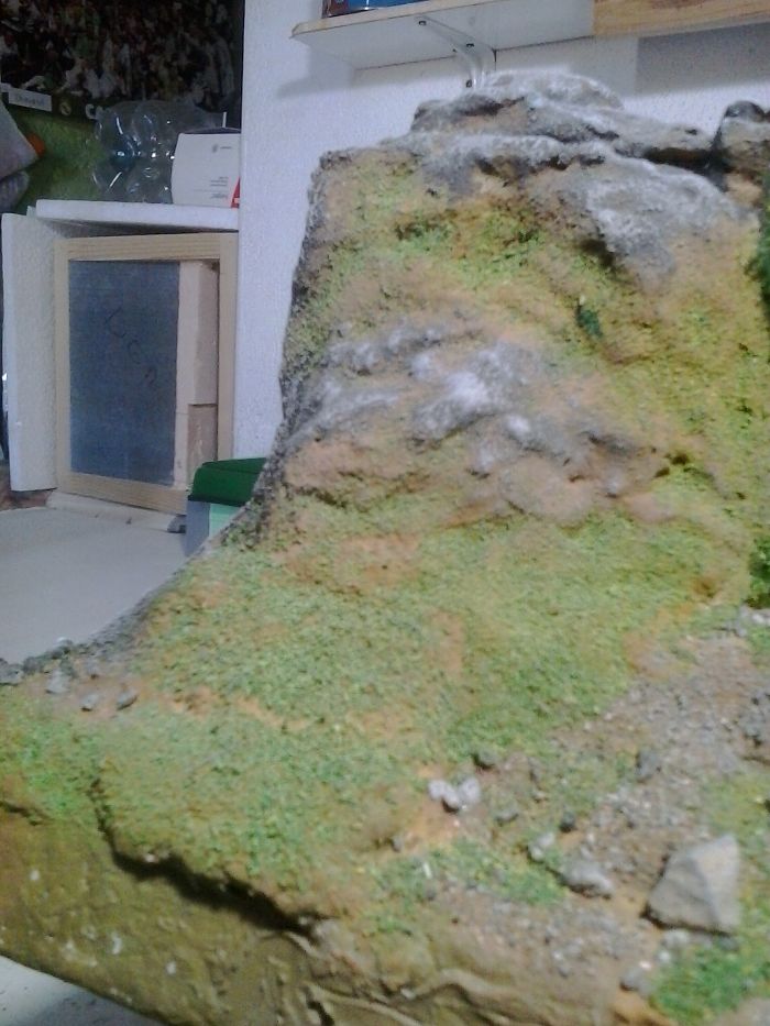 Chus perdona que no te haya contestado antes, he estado fuera de servicio. Las piedras a las que te refieres, son trocitos maltratados de porex, pegados uno a uno y con un ligero paso de aguarras, escayola con el colador y pintados con tierras(Pigmentos) intentando copiar la tecnica del maestro Ruben(Artesanodelbelen). Intente que no tuviesen el mismo color que las demas piedras de granito y salio ese color. Me puse a hacer un arbol como os dije y aunque esta parado, de momento me esta saliendo esto: