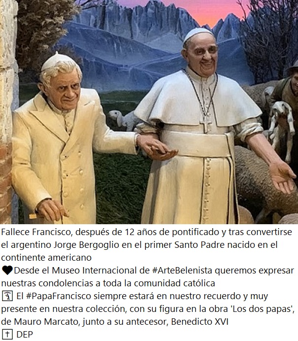 487450528_1114913717342051_843400339437205955_nKvwo8-f-Om.jpg (89KB - 33 descargas)Se destacan como sus principales aportaciones las encíclicas Fratelli Tutti y Laudato Si, sobre la fraternidad y el cuidado del medio ambiente respectivamente, pero los belenistas recordaremos especialmente por la Carta Apostólica Admirabile Signum, sobre el significado del Belén, dada a conocer en la visita de Francisco a Greccio, en 2019: