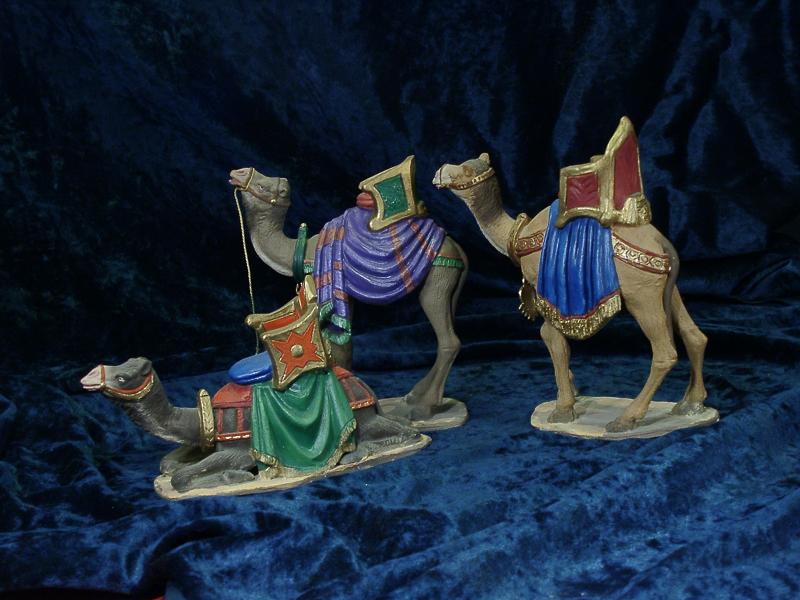La Adoración de Reyes que te muestro es de 11 cm. y de la década de los 60. Te adjunto también una fotografía de los pajes y camellos que acompañaban a este grupo. En este momento no dispongo de fotografías mejores, pero si tienes mucho interés te facilitaré otras desde otros ángulos.