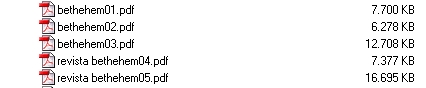 La Agrupación Belenista La Morana, http://www.geocities.com/belenlamorana/menu.htm pone a disposición de todos nosotros, su revista "Bethlehem" en formato pdf desde el año 2.001 al 2.005. Yo he intentado bajarmela, pero no hay manera, si alguno de vosotros lo consigue, me gustaría que me las enviara a mi dirección de correo.