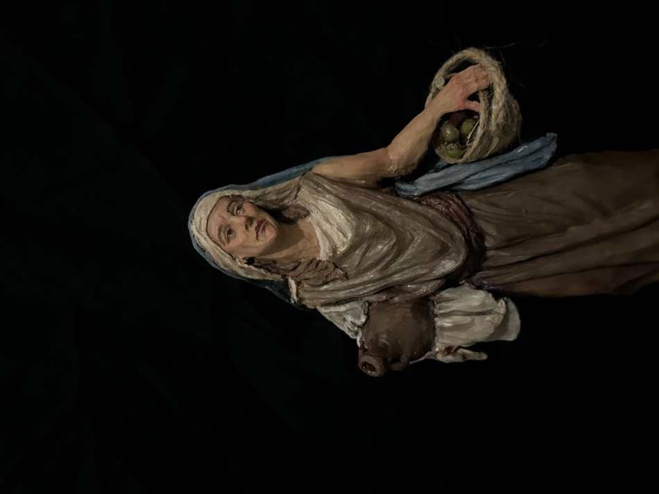 Trabaja solo a palillo, tanto figuras de barro a talla completa (el grueso de su producción) como figuras de barro enteladas, en todos los tamaños.