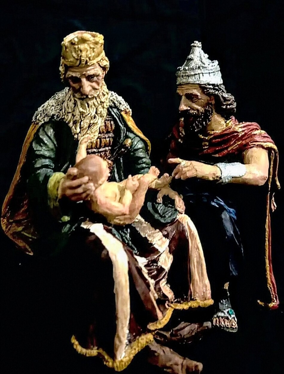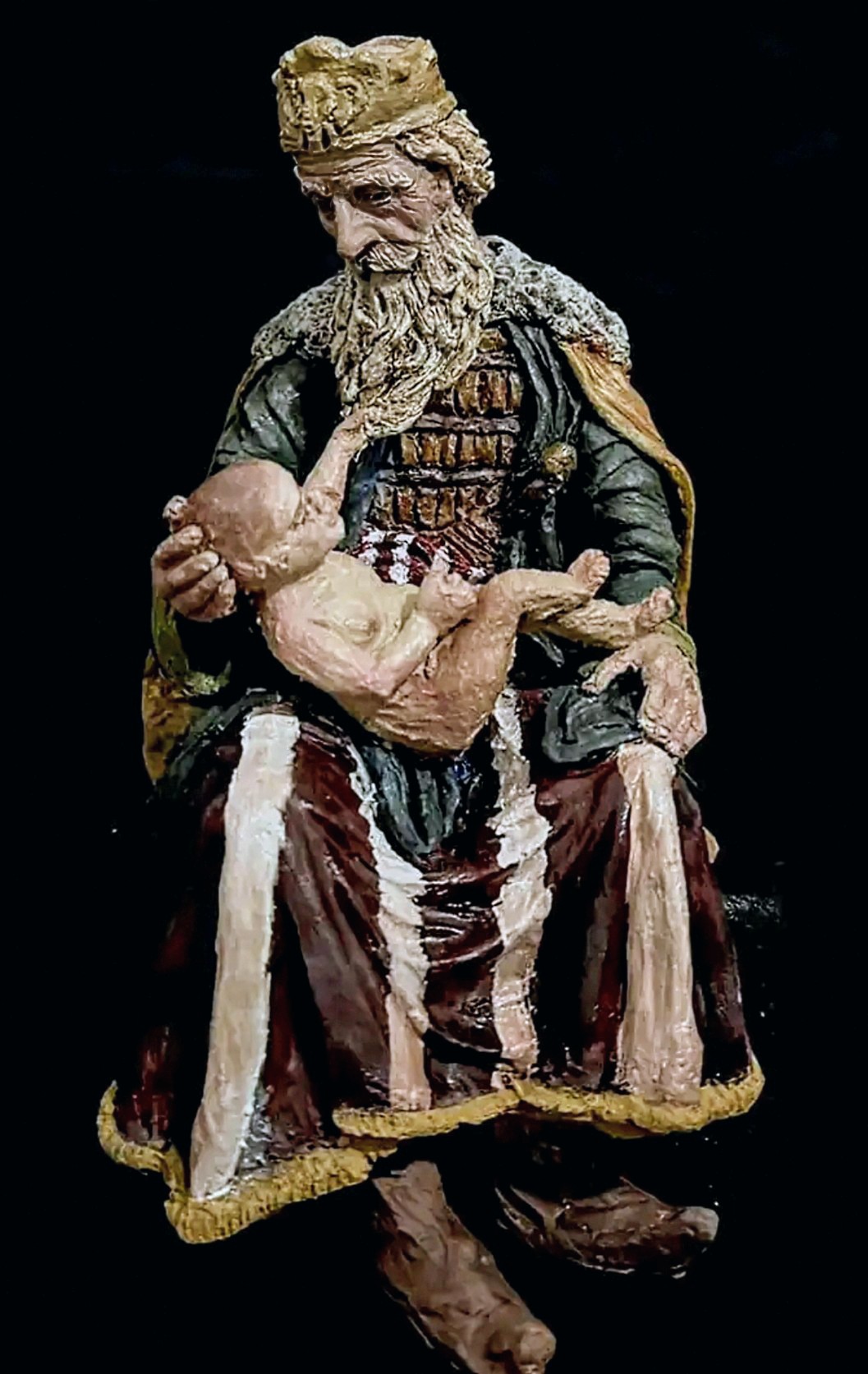 "Esta escena intenta capturar un instante lleno de simbolismo y humildad. El Rey Melchor, con su mirada serena, sostiene al Niño Jesús con ternura, mientras este, en su pureza y divinidad, juega inocentemente con su barba, un gesto que refleja la armonía entre lo humano y lo divino. A su lado, el Rey Gaspar, arrodillado, observa con reverencia, intentando acercarse también al Niño con un gesto de ternura y complicidad. La escena busca transmitir que, en la sencillez del Niño, todos somos invitados a participar, sin distinción, en el abrazo del amor divino. Es un recordatorio de que la verdadera grandeza se encuentra en la humildad, y que el amor de Dios, representado en el Niño Jesús, es un regalo que trasciende las coronas y los tronos, invitándonos a todos a ser parte de su luz."