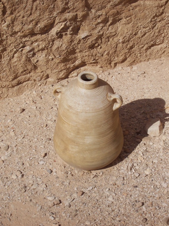 Las piezas presentadas serían ánforas vinarias cananeas para el transporte y almacenaje de vino. Son semejantes a las Púnicas y también podían utilizarse para el almacenaje de agua en las casas. Los tamaños reales de ellas serían de unos 50 cm de altura y una capacidad aproximada de 2o litros