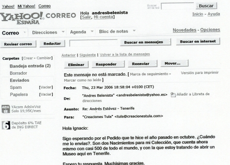 Desde el mes de octubre del pasado año, le encargué a CREACIONES TULA vía Internet, dos Nacimientos. Hasta la fecha no me los ha enviado. Por otro lado, le mandé hace unos días un Correo y no me contesta. Ante lo que me gustaría saber, si algún compañero del Foro le ha encargado por este citado Medio algo a esta Empresa y le han atendido, para ver cómo lo ha hecho.Saludos.