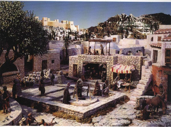 Estábamos en lo cierto. Literal de lo que podemos leer en la página 69 de libro del B. Bancaja: La plaza de belén ha sido reconstruida a partir de los materiales encontrados en el artículo COMO VIVIERON LOS GRANDES PERSONAJES DE LA BIBLIA, de Selecciones Reader´s Digest. Voy a escanear la foto para que la compares.