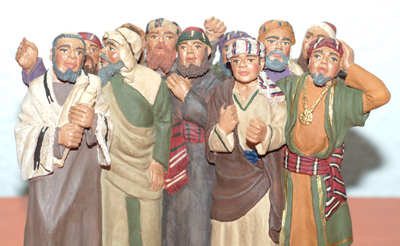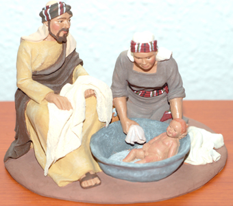 Zacarias, ¿Como te imaginas una matanza de los inocentes dulce? La matanza fue un acto atroz i como acto atroz tiene que responder la representacion de las figuras. Cuando pense la escena le daba mucho dramatismo el hecho que se viera parte de lo que havian hecho los soldados. Y las reacciones de los consejeros, el judio horrorizado, i el romano como lo más normal del mundo.