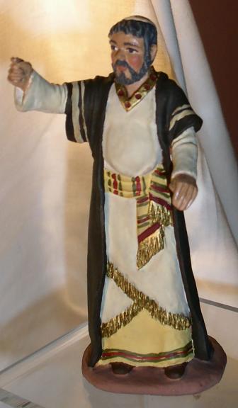 1.- Por una cuestión de mensaje, para que se viera el contraste entre la pobreza de la Sagrada Familia, que pide auxilio, y la riqueza del posadero, que lo deniega. Además tiene una prominente barriguita, mientras que los restantes personajes del belén son flacuchos (cogí la idea del posadero gordo de Dani Alcántara). Puede suponerse, además, que el posadero sea un tipo más rico que el resto de los conciudadanos, es más, puede ser el alcalde o el jerifalte del pueblo.