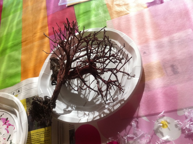 Está hecho con tronco de bonsai de olivo que no sobrevivió al verano (estoy secando las raices a ver si sirven para algo), fibra de maquetas Poly Fiber, esa maraña verde que es como lana de acero y un saquito de flores de tela que encontré en Larraz, mercería muy famosa de Zaragoza.