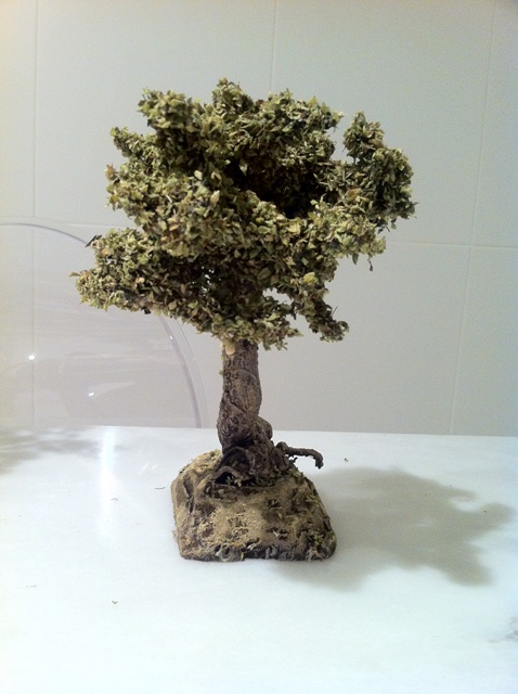 Está hecho con tronco de bonsai de olivo que no sobrevivió al verano (estoy secando las raices a ver si sirven para algo), fibra de maquetas Poly Fiber, esa maraña verde que es como lana de acero y un saquito de flores de tela que encontré en Larraz, mercería muy famosa de Zaragoza.
