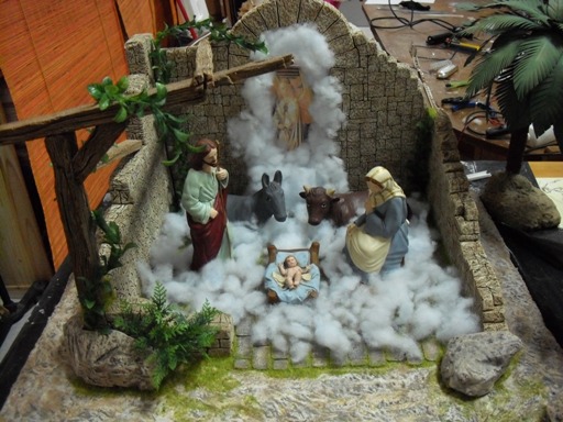 D: TONIATO, al fin puedo dar opinión aprovechando que M: está cocinando. jeje. A mi gusto personal, individual e intransferible (a menos que venga M: en este momento y me lo cambie) te diré que TOOOODAS las ideas me parecen geniales, pero, desde mi punto de vista, tendrías que pararte a cierta distancia y visualizar todo el conjunto donde estará integrado el portal, para que así puedas ver o imaginar el efecto general que querés lograr. Por Ejemplo: 1 )si ponés una construcción alta a la derecha del portal (que podría ser la posada), podes poner un foco que ilumine solamente las figuras del nacimiento desde un punto mas alto. 2) detrás del arco del portal, probá continuar un camino con una niebla difusa sobre él (por supuesto que con guata, y con un solo leds para que sea solo un efecto secundario que dé continuidad y no reste importancia al nacimiento) 3) a la izquierda, vegetación baja y sin luz para que dé la sensación de pradera. 4) Perdoname si te embolé (mareé, empedé, emborraché, .........etc.) , es que ya me hice toda la película. jaja.