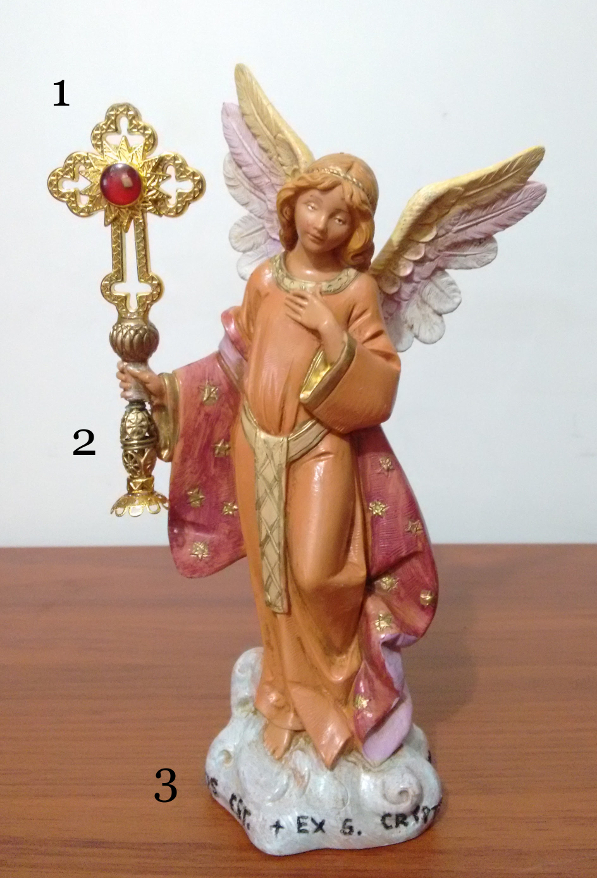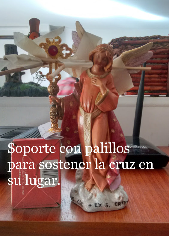 1. La figura original traía una vela. Esta se la retiré para poner la reliquia en forma de cruz de altar. La cruz la pegué con pegamento epóxico transparente (el de dos componentes mezclables) a la esfera que sirvió de base. Para sostenerla en su sitio mientras se secaba el cemento epóxico hice un armazón de palillos como se ve en una de las fotos.