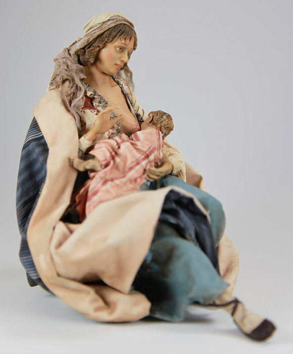 Su trabajo en 30 cm es espectacular en modelado y acabado y normalmente son figuras vestidas, queire decirse que trabaja caras, manos y pies y el resto es vestido con telas muy selecionadas y bien trabajadas. Hay varias web que tiene sus figuras y en su taller directamente