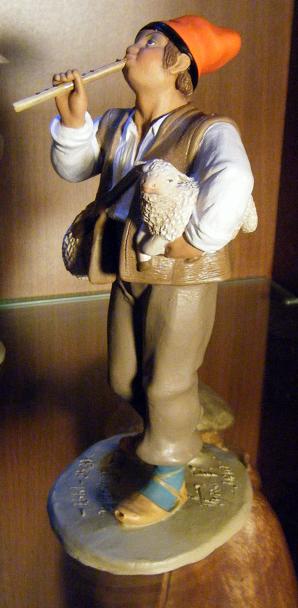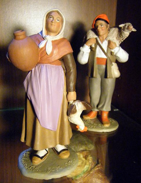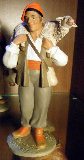 Su producción es muy limitada en cuanto a número de figuras, pero bastante variada, y los precios son muy razonables. Os cuelgo las figuras del nacimiento catalán de 15 cm que he adquirido, precedidas de una preciosa figura de 9 cm muy carrataliana, un personaje catalán de vestimenta muy pintoresca, yo diría que casi dieciochesca. A mi entender, el San José de este nacimiento es la obra maestra de Carratalà. El conjunto es precioso y como en todo Carratalà, que era un gran actor de teatro, un pelo postizo, como si en vez de auténticos pastores fuera una representación de "Terra Baixa" con los artistas perfectamente caracterizados... el "maquillaje" de San José, que en todas sus reproducciones (sean del Avi, de Montserrat o de Toni) parece llevar rimmel, los párpados com sombra y colorete en las mejillas, así como su vestimenta (de señor rural yendo a la fiesta mayor) y su postura "posando" refuerzan la impresión. También el "patillas" parece posar para una fotografía, el flautista parece estar en la representación de los Pastorets y el Patufet, pues... es extraordinario, con un punto de caricatura. El conjunto es excepcional y toda una "opinión" de Carratalà sobre lo que significa el belén, que no es un "retrato" de lo que pasó en Belén, sino una "representación" que hacemos los cristianos sobre el relato que nos ha llegado. Entiendo que los que no sois catalanes no os emocionéis con ese mar de "barretines", pero yo creo que es una obra muy muy hermosa.