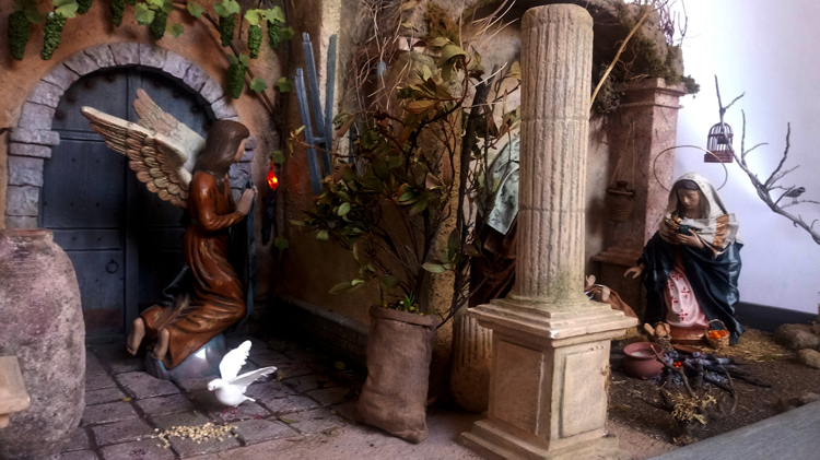 Anunciación realizada con figuras de 25 cms. Tiene unas dimensiones de: 92 x 44 x 50.