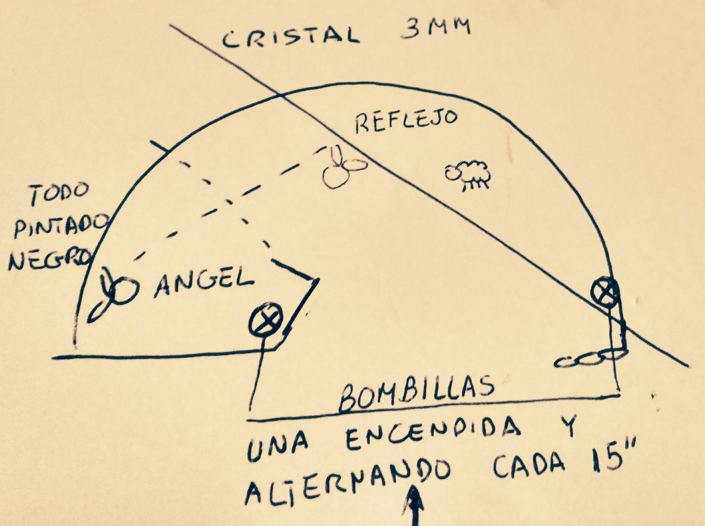 Peteorito y felorz, el método es realmente sencillo, todo lo que se ve es el reflejo sobre un cristal, del ángel que esta escondido en una zona oscura, y que se proyecta cuando una luz también escondida se activa, os pongo un croquis aunque aquí en el foro hay información de enorme calidad