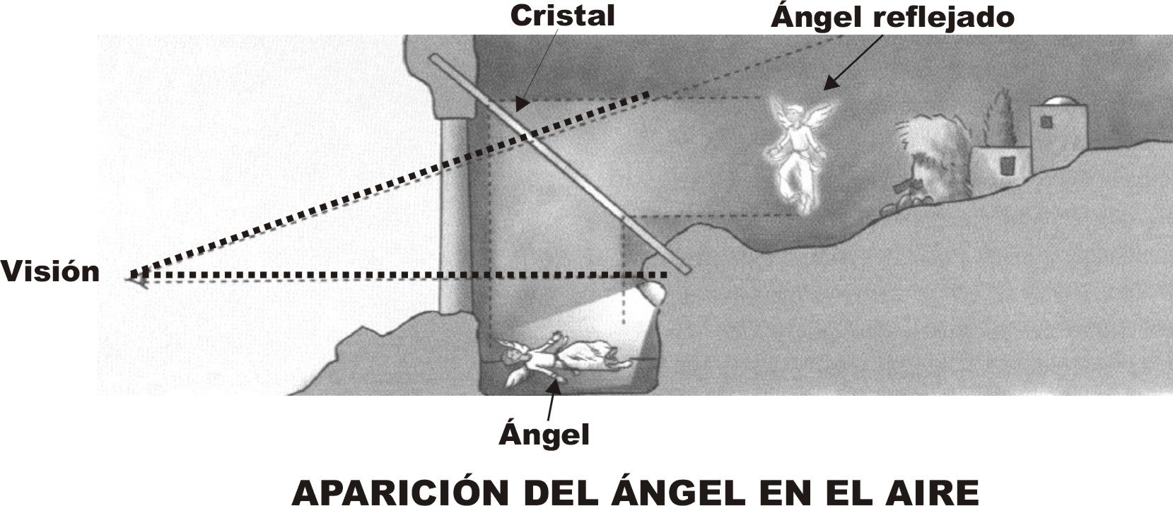 -en proximidad a la situacion de los pastores y enfrentado a la colocación de espectador, formando angulo con la embocadura, situaremos un cristal transparente, de un tamaño aproximado del doble del angel a reflejar.