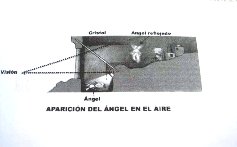 -en proximidad a la situacion de los pastores y enfrentado a la colocación de espectador, formando angulo con la embocadura, situaremos un cristal transparente, de un tamaño aproximado del doble del angel a reflejar.