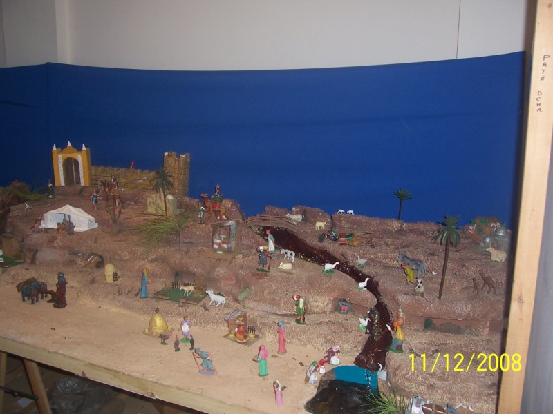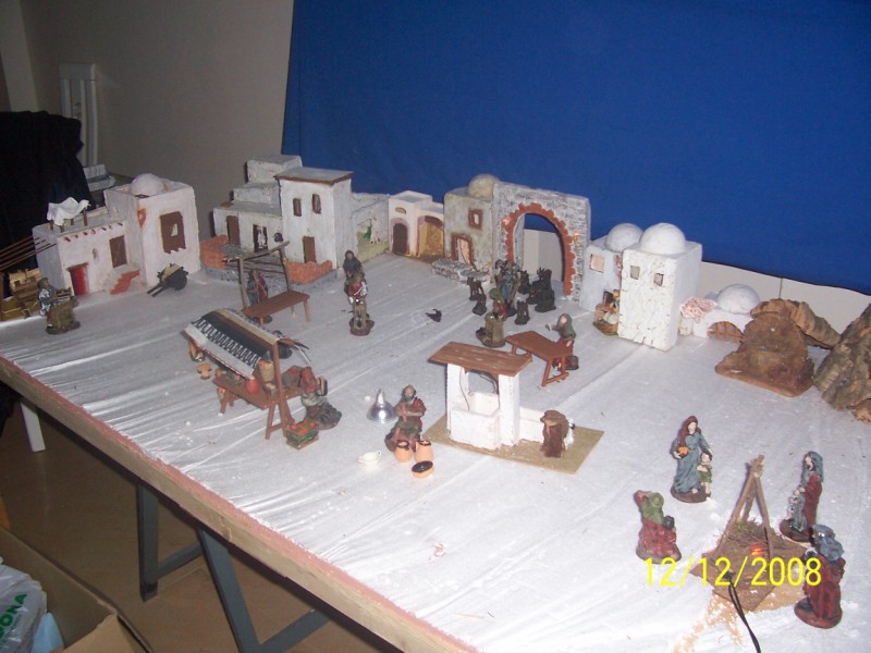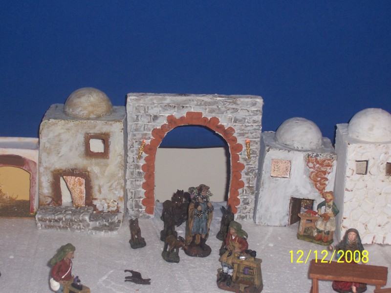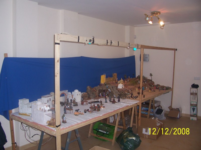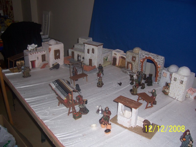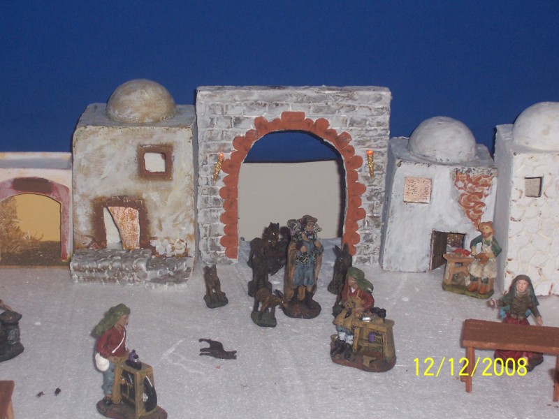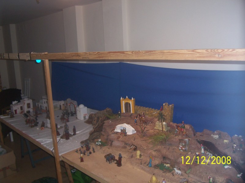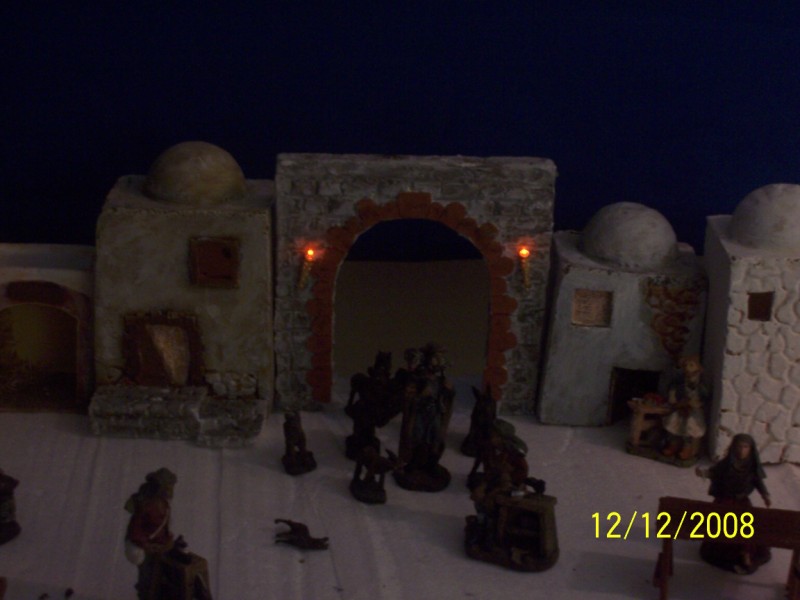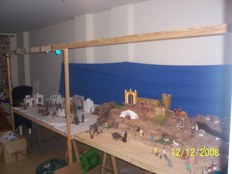 Hola,te daré mi parecer Mario,en primer lugar has conseguido con tu belen algo que ya no se hace,en el están el ayer y hoy de los belenes,da gusto verlo,sus figuritas de plastico,sus figuritas de resina,su rio,sencillito,bonito,construcciones,jaima,puestos de venta,pero todo hecho con mucha ilusion de eso no hay duda,solo hay que verlo,realmente no hay que disponer de grandes cosas para montar un belén,trabajar un poco y ahi el resultado,con respecto al arco,ya que tienes el trabajo hecho ,yo le pondría un trozo de porex imitando un muro hasta la altura del azul de la tela,pero puesto en diagonal,con respecto al arco,es decir que parezca que la gente entra por el arco y que viene de otra calle de detrás,seria una solución para salir del paso,pintas el porex,algo de verdin y ya está,lo demás bien,a mi parecer,un belén acogedor,bonito,bien trabajado,y hecho con ilusión,felicidades y que lo disfrutes.saludiños