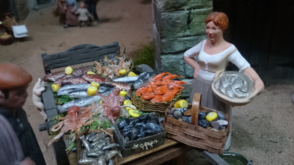 La pescadera es de Arterra, una marca de santoniers de Provenza y el hombre que la acompaña es de Mayo , del belen madrileño ,también lo son el churrero y el sereno que aparecen más tarde,  la mujer que acompaña al churrero y el niño también son de Arterra.