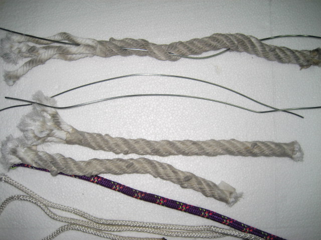 Foto 2    Corto así mismo, unos trozos de alambre de similar longitud y los entremezclo con los cabos que componen cada trozo de cuerda para dar consistencia y poder dar una primera forma al cuerpo del árbol.