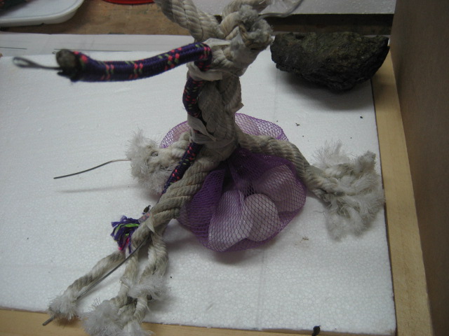 Foto 2 Corto así mismo, unos trozos de alambre de similar longitud y los entremezclo con los cabos que componen cada trozo de cuerda para dar consistencia y poder dar una primera forma al cuerpo del árbol.