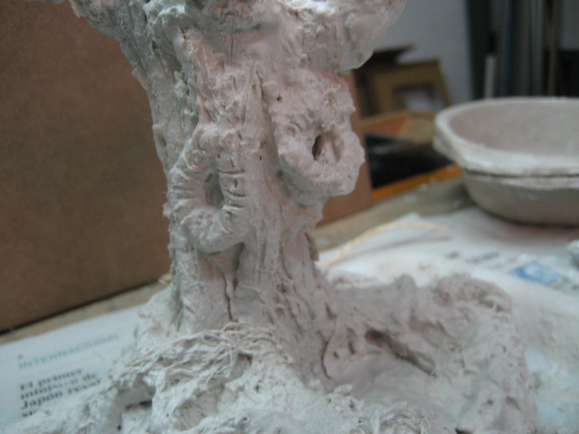 Foto 5 y 6     Cubro todo el conjunto con tiras de escayola y papilla de escayola procurando adaptarlas a las distintas cuerdas y haciendo rayas y líneas con una espátula pequeña de pintor antes de que endurezca del todo para dar textura al tronco y a las ramas.