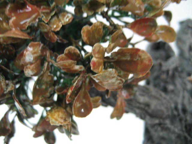 Foto 11 y 12    Las hojas son de plástico de plantas compradas en tiendas de "bazar" sumergidas en tapaporos y una vez seca esta capa, pintadas con pinturas acrílicas con los colores que cada uno prefiera, ocres, rojo inglés, amarillo, verde etc.