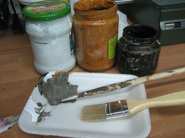 Foto 7 y 8     Color de base.Antes de pasar a la pintura y como tiene gran cantidad de escayola, le he dejado secar perfectamente durante dos dias.Uso pinturas acrílicas de las recomendadas en el foro por distintos compañeros de los que todos aprendemos (Galtxa, Emore, Carlos Marcos etc,etc)Le he dado una base de un color caqui muy oscuro formado con ocre al que sele añade negro.Y en las zonas de recobecos, negro total.