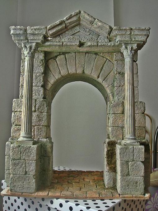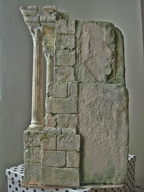 La técnica que he utilizado es un encofrado de escayola teñida con pigmento negro, luego veladuras de grises, siena natural, marrón y finalmente tallar cada piedra.